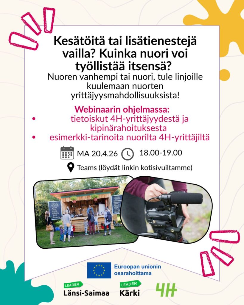 – tietoiskut 4H-yrittäjyydestä ja kipinärahoituksesta nuorille yrittäjille.
